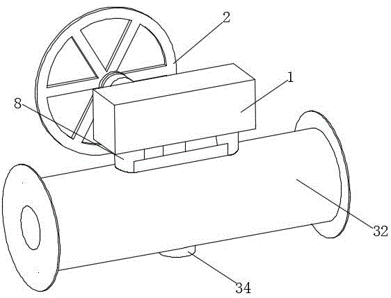 請參閱圖1-4,本實用新型提供一種技術方案:一種調流全焊接球閥,包括球閥單元3、上轉動單元4和齒輪箱1,球閥單元3包含有閥體31、連接管32、閥座33和下固定塊34,連接管32設有兩個且焊接在一起,其中部形成腔室,閥體31安裝在腔室內,連接管32的兩端均設有法蘭,閥體31的中部設有通孔,通孔大小與連接管32的內壁直徑相同,方便調節流量,閥座33安裝在閥體31與連接管32的接觸面上,并與閥體31緊密接觸,閥體31的頂端與上轉動單元4連接,上轉動單元4的頂端通過連接柱8安裝有齒輪箱1,齒輪箱1用于調整旋轉盤2的方向,便于進行方向調整,齒輪箱1上轉動連接有轉桿13,且轉桿13的端部設有旋轉盤2,旋轉盤2能夠更省力的對球閥進行控制,齒輪箱1內安裝有蝸輪5和蝸桿6,蝸輪5安裝在上閥桿41的頂端,蝸桿6與齒輪箱1的內壁轉動連接,蝸桿6與蝸輪5相互嚙合,且轉桿13與蝸桿6通過連接塊12連接,方面隨意更換轉桿13以達到合適的長度,閥體31的底端通過下閥桿9與下固定塊34轉動連接,上轉動單元4包含有上閥桿41、安裝座42和固定桿43,固定桿43與閥體31的頂端固定連接,固定桿43內嵌入閥體31內,提升轉動的穩定性,且與連接管32通過軸承轉動連接,固定桿43與閥體31一體化安裝,方便進行更換上閥桿41,安裝座42安裝在固定桿43的頂端,上閥桿41通過安裝座42與固定桿43連接,利用安裝座42可以快速的拆卸與安裝上閥桿41;其中,上轉動單元4與連接管32轉動連接,還包括固定板7,固定板7安裝在連接管32的外側面,有用對安裝座42進行固定,且固定板7的兩端分別與兩個連接柱8連接,安裝座42與固定板7通過軸承轉動連接,還包括墊片10和彈簧11,墊片10安裝在下閥桿9與下固定塊34之間,墊片10與下閥桿9的底端部分滑動連接,彈簧11的一端與墊片10連接,彈簧11的另一端與連接管32連接,且彈簧11的中部設有伸縮桿,起支撐作用,防止發生位移。